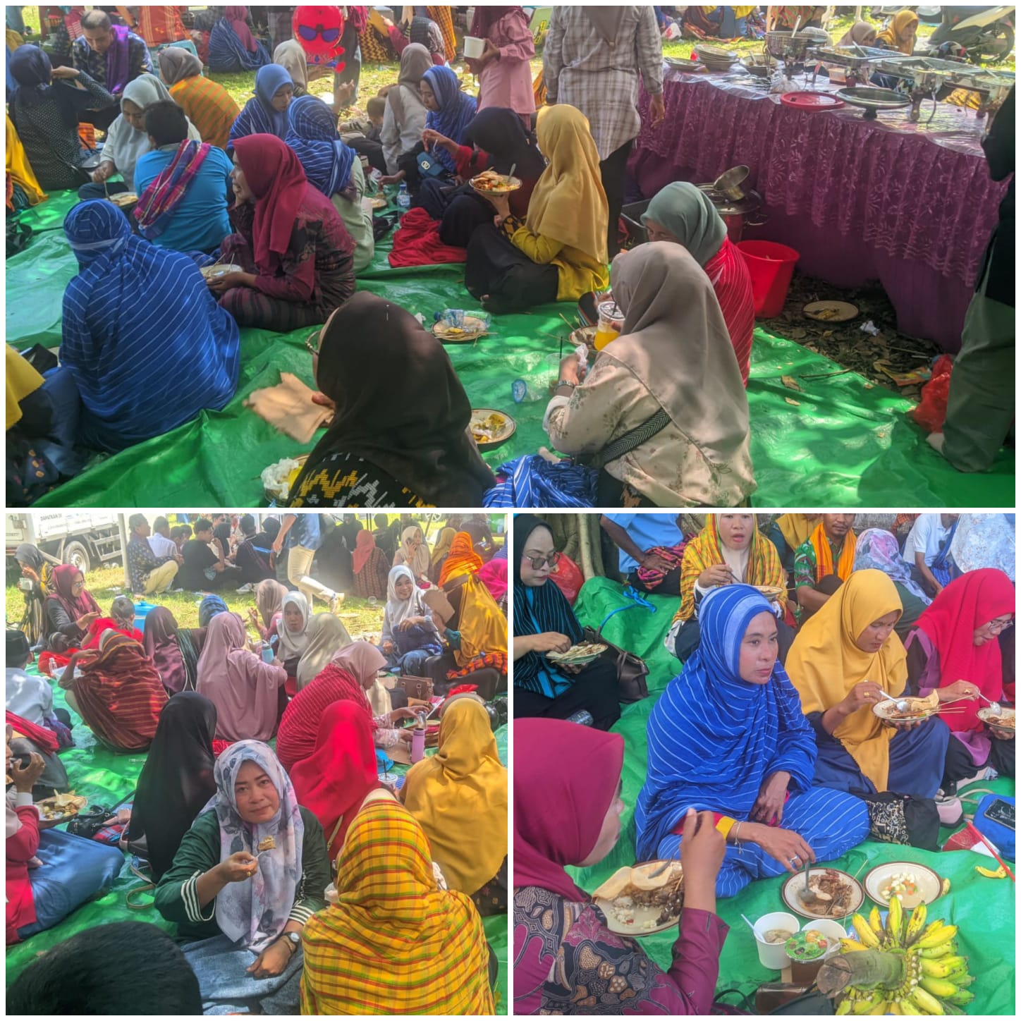 Masih dengan balutan rimpu yang anggun, para siswa, guru, dan staf sekolah duduk bersila dalam suasana santai. Tawa dan cerita ringan mengalir di antara mereka, menggantikan rasa lelah yang sebelumnya menyelimuti. Momen ini menjadi salah satu bagian paling dinantikan setelah mengikuti rangkaian kegiatan budaya yang cukup menguras energi.